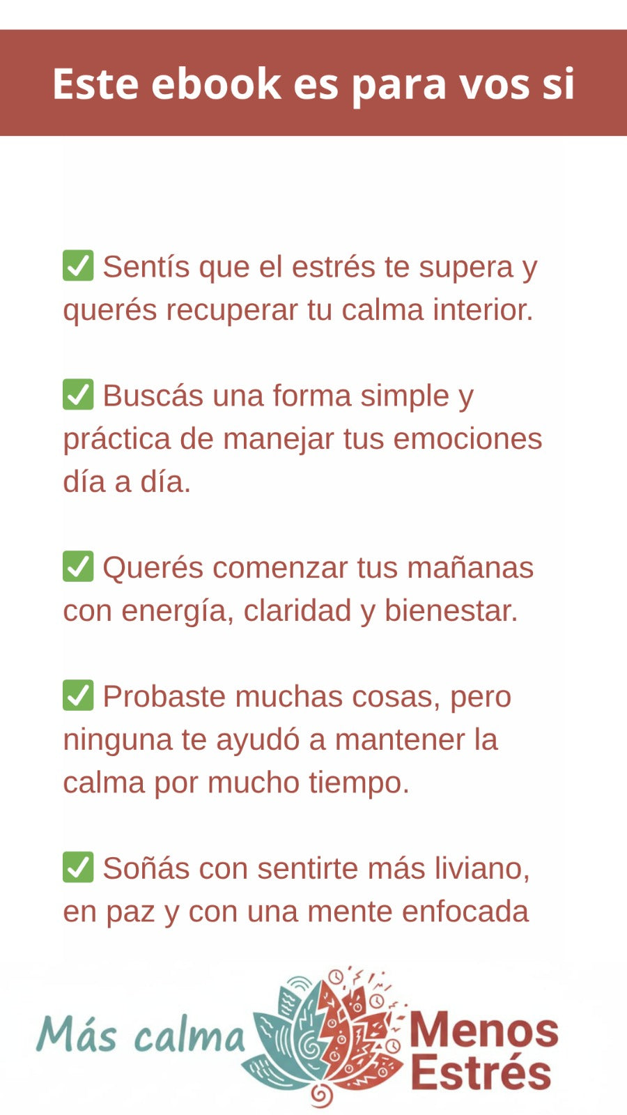 Este ebook es una guía práctica para aprender a manejar tus emociones, reducir la ansiedad y recuperar el equilibrio interior. Incluye ejercicios simples, hábitos diarios y herramientas que podés aplicar desde el primer día.